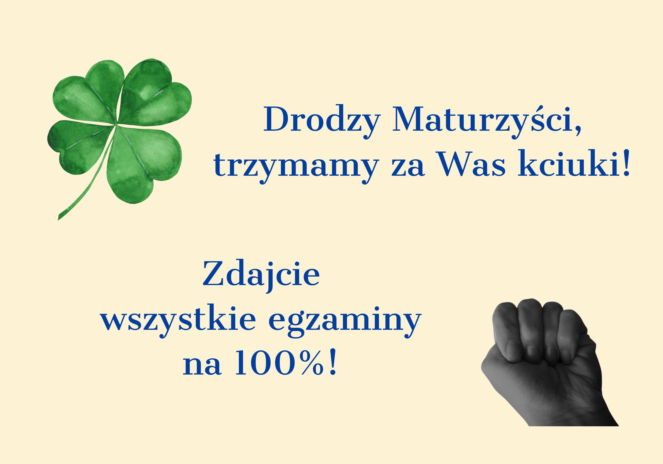 Na koniec chcielibyśmy życzyć naszym maturzystom jasności umysłu, połamania pióra, trafionych tematów oraz kreatywnego wykorzystania wiedzy i umiejętności, których nabyliście w szkole, a także wiary we własne siły, spokoju i… szczęścia!