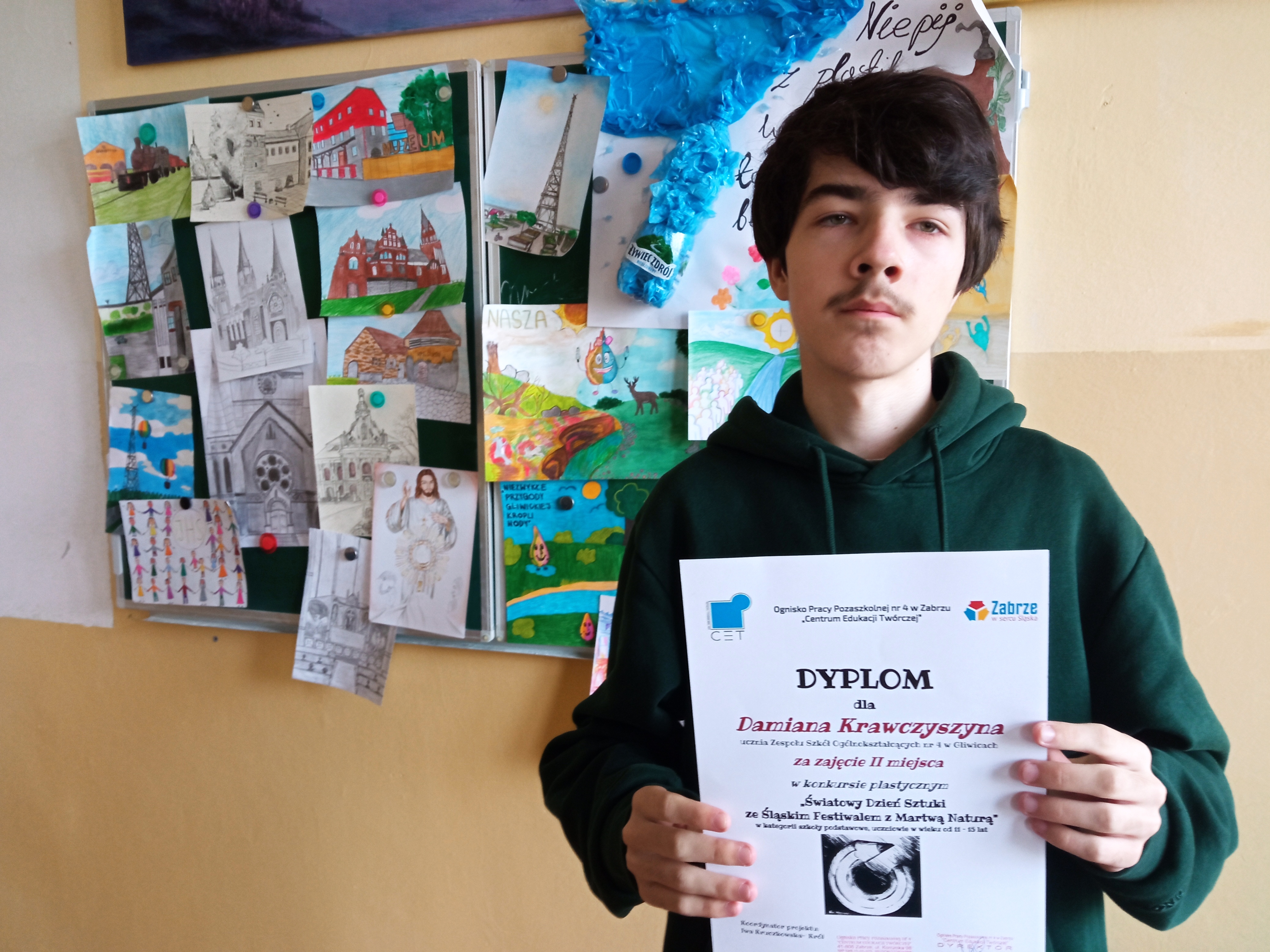 Miło nam poinformować, że w wojewódzkim konkursie plastycznym „Światowy Dzień Sztuki ze Śląskim Festiwalem z Martwą Naturą” mamy laureatów. Drugie miejsce należy do Damiana Krawczyszyna z IA LO, a wyróżnienie zdobyła Oliwia Najda z IE LO.