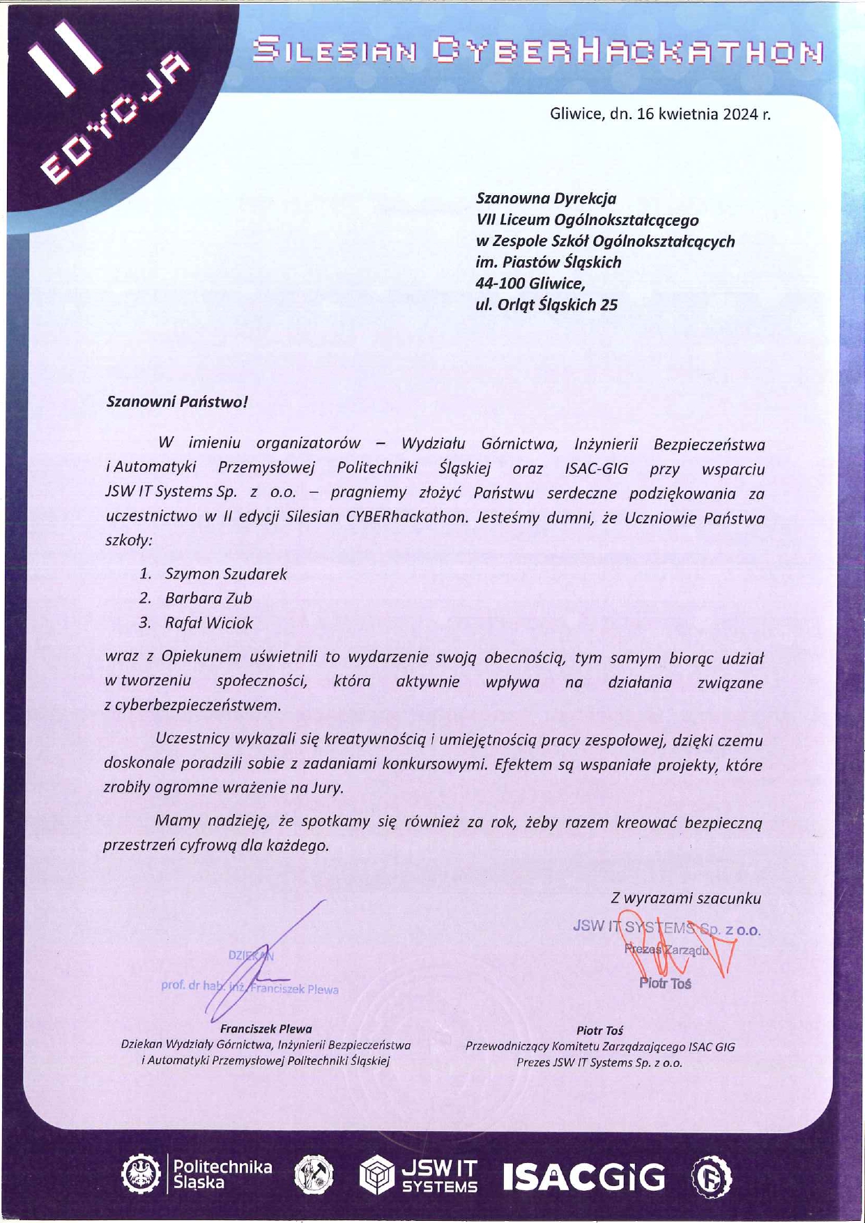 5 kwietnia uczniowie naszego liceum: Barbara Zub, Szymon Szudarek i Rafał Wiciok z klasy IIA wzięli udział w II edycji Silesian CYBERhackathonu na Politechnice Śląskiej. Organizatorzy piszą o nim tak: Celem wydarzenia jest zwiększanie świadomości społecznej na temat wpływu technologii cyfrowych na życie codzienne i zawodowe, w tym na zwiększanie bezpieczeństwa fizycznego i cyfrowego oraz ochronę klimatu, a także zachęcenie do tworzenia rozwiązań wspomagających te działania.