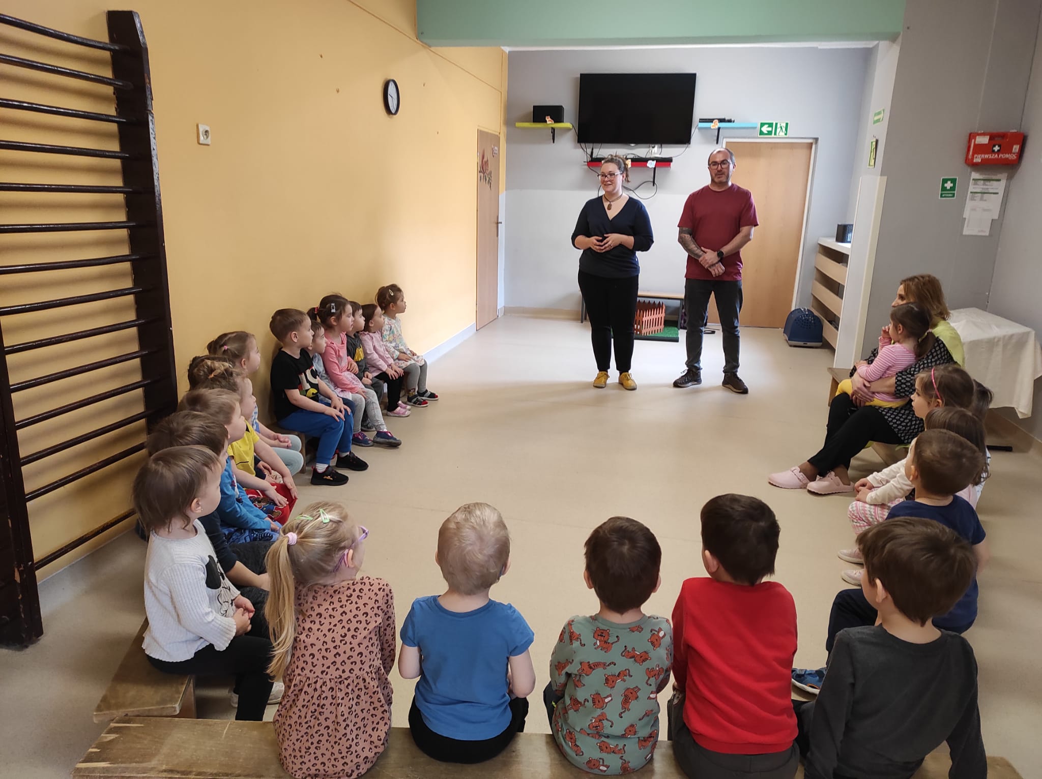 Musieliśmy się nie lada natrudzić przy piosence, głośnych okrzykach: „Ho, ho, ho” oraz kilku ćwiczeniach gimnastycznych, zanim wreszcie pojawił się nasz gość – św. Mikołaj, który przypomniał nam o listach i zapewnił, że prezenty już na wszystkich czekają.