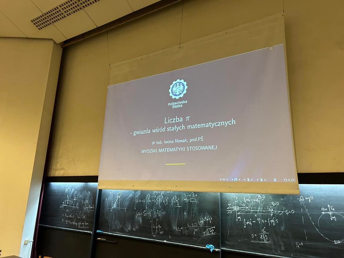 Pierwszym wykładem, którego wysłuchali uczniowie, była prezentacja p. dr hab. inż. Iwony Nowak na temat: „Liczba Pi – gwiazda wśród stałych matematycznych”. Nasi uczniowie mogli poznać obecny rekord w wyznaczaniu wartości liczby Pi czy rozwiązać rebusy z liczbą Pi w roli głównej.